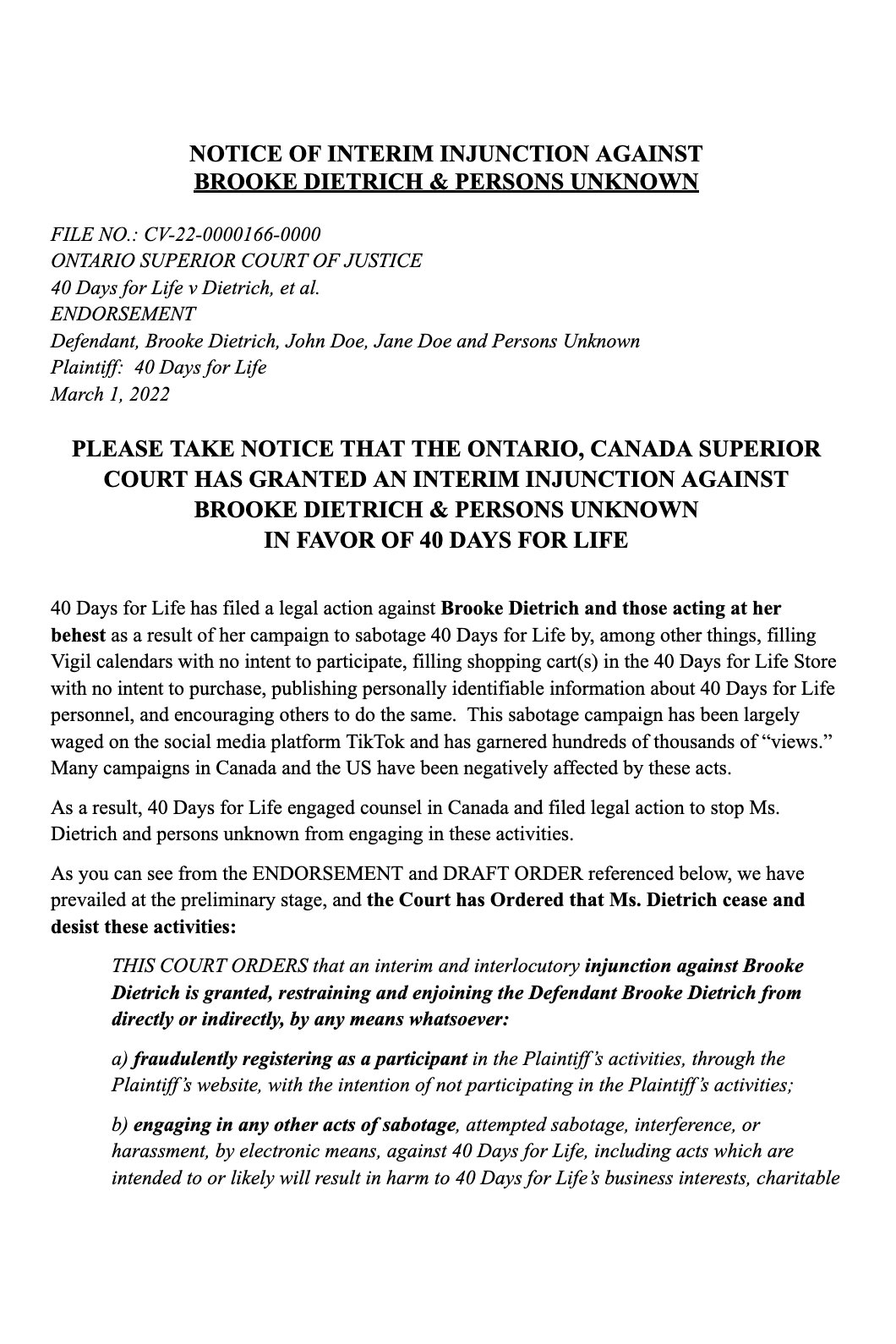 40 Days For Life On Twitter Notice Of Interim Injunction Against Brooke Dietrich Amp Persons Unknown Https T Co E2auevhb8v Twitter